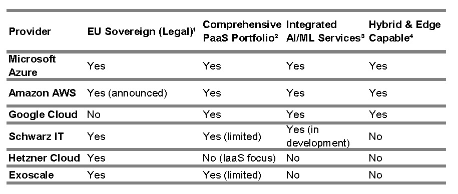 ¹ EU Sovereign (Legal): Data infrastructure and operator are subject to EU law. US hyperscalers use trustee or separate entity models.